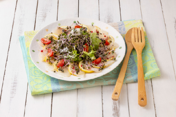 スプラウトカルパッチョ 日本ガスアグリ様の「すごい野菜」リーフレット、ホームページ掲載用に撮影。商品の紹介と併せて、おいしく野菜を食べられるレシピを考案しています。弊社スタジオで「すごいスプラウト パープルバジル」を使用したカルパッチョを実際に調理して撮影しました。