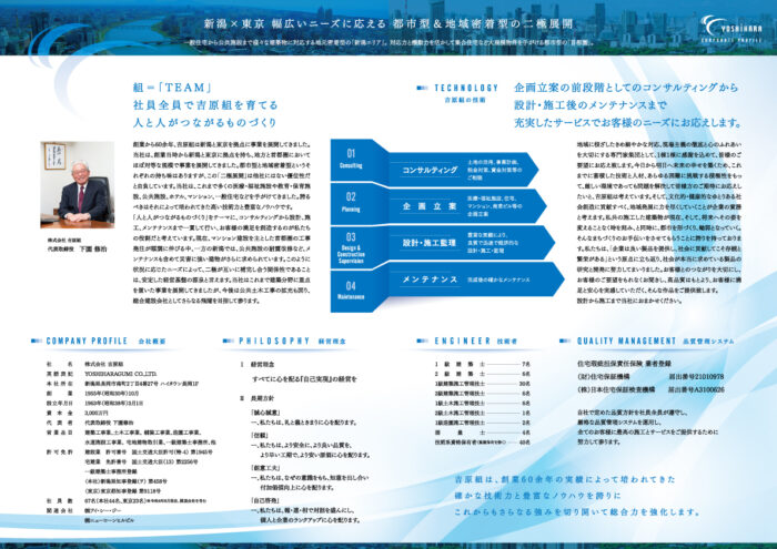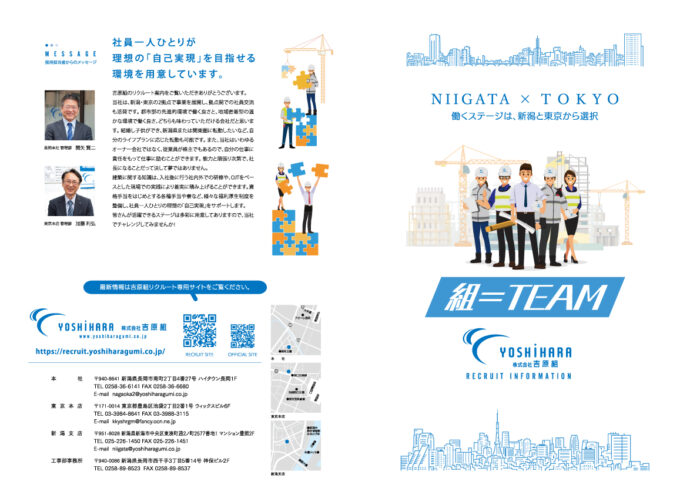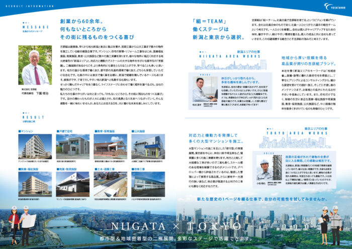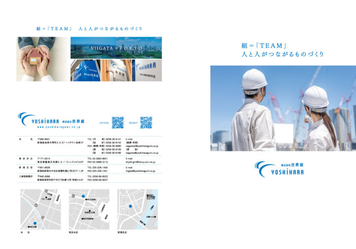 新潟県と東京都に拠点を置き、「組=TEAM」を合言葉に地域密着型と都市型の二極展開で幅広いニーズに応えている総合建設会社様。現地取材・撮影を行い、ホームページ、リクルートサイト、会社案内、リクルートリーフレット、周年ロゴを制作させていただきました。