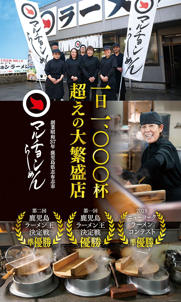 昭和37年創業、志布志に本店、鹿屋市に支店を構え、地元の方々から長年愛され続ける老舗ラーメン店「マルチョンラーメン」様。