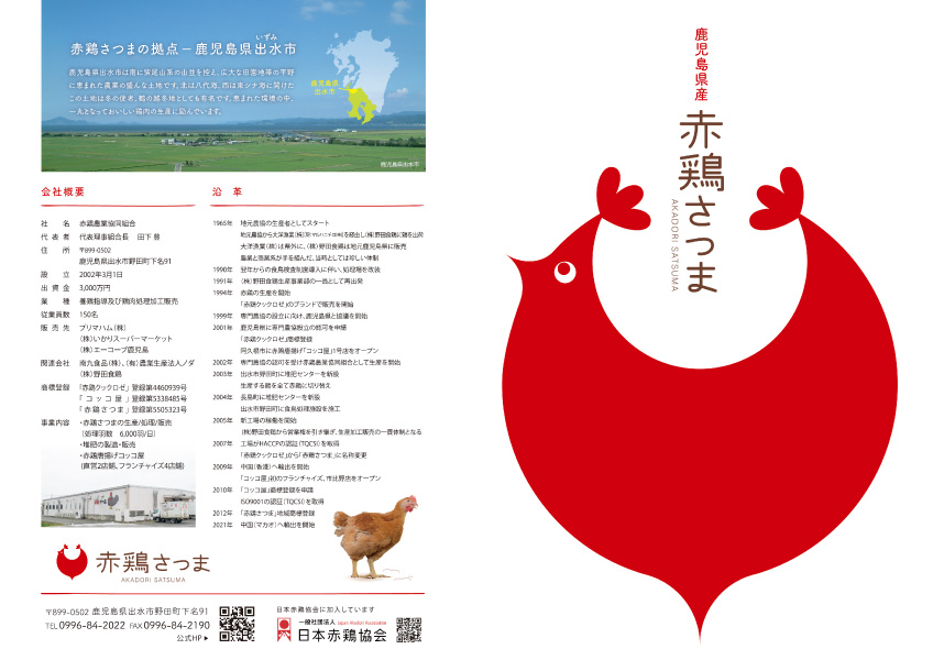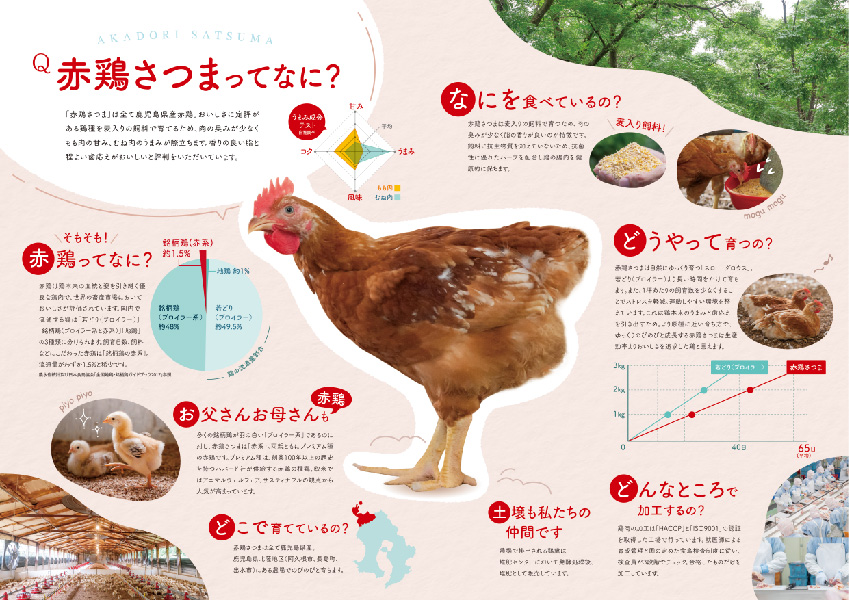 赤鶏農業協同組合さまが生産から加工・販売まで行っている鹿児島県産赤鶏「赤鶏さつま」のブランディングデザイン。現地での取材・撮影を行い、ロゴマーク、リーフレットの制作をさせていただきました。
