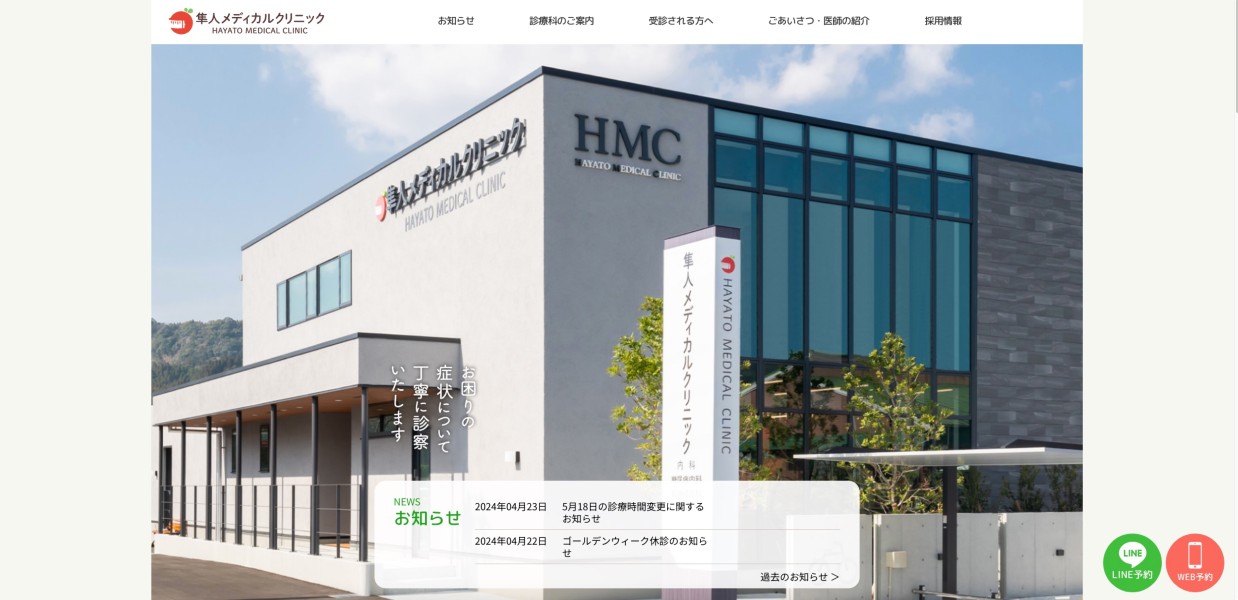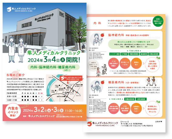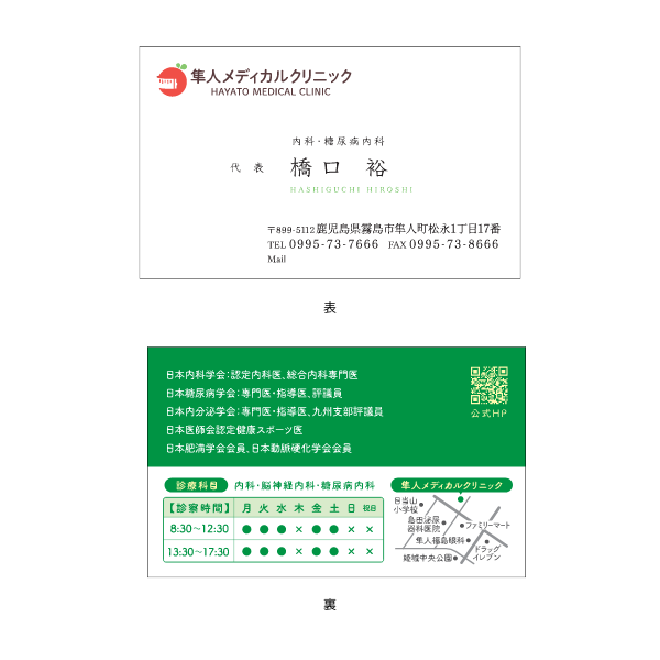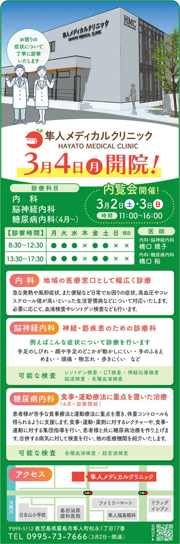 鹿児島県霧島市隼人町松永で内科・脳神経内科・糖尿病内科の医療を提供する隼人メディカルクリニック様のロゴマーク、開院チラシ、名刺、新聞広告、電柱広告、ウェブサイトの制作、撮影をさせていただきました。