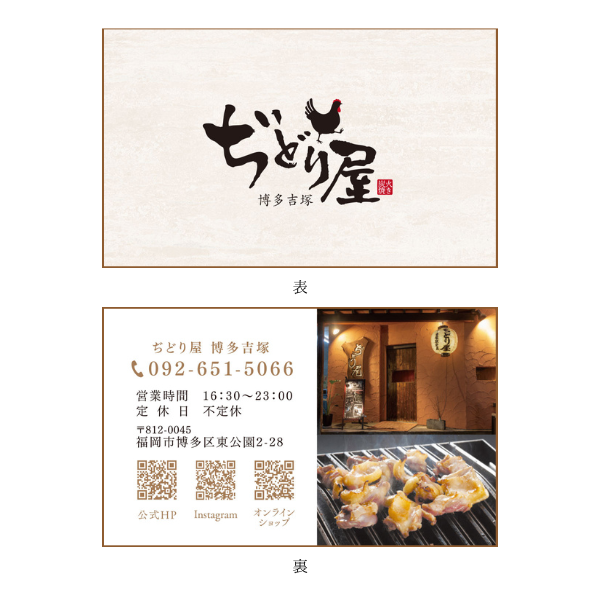 博多にある鶏料理専門店、ぢどり屋 博多・吉塚様。独自に開発した特製の炭火焼鉄板と備長炭での炭火焼が名物です。ロゴマーク、現地での取材・撮影、webサイト、ショッピングサイト、リーフレット、シール、ショップカード、名刺を制作させていただきました。