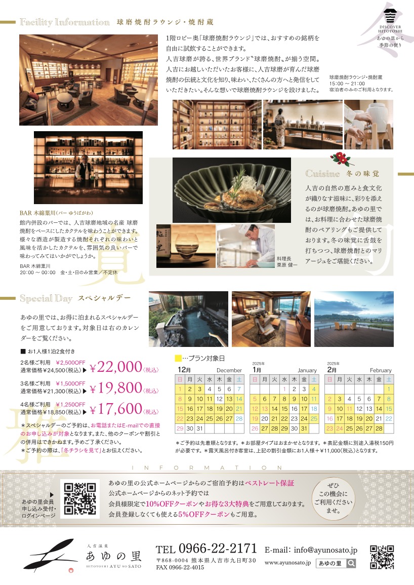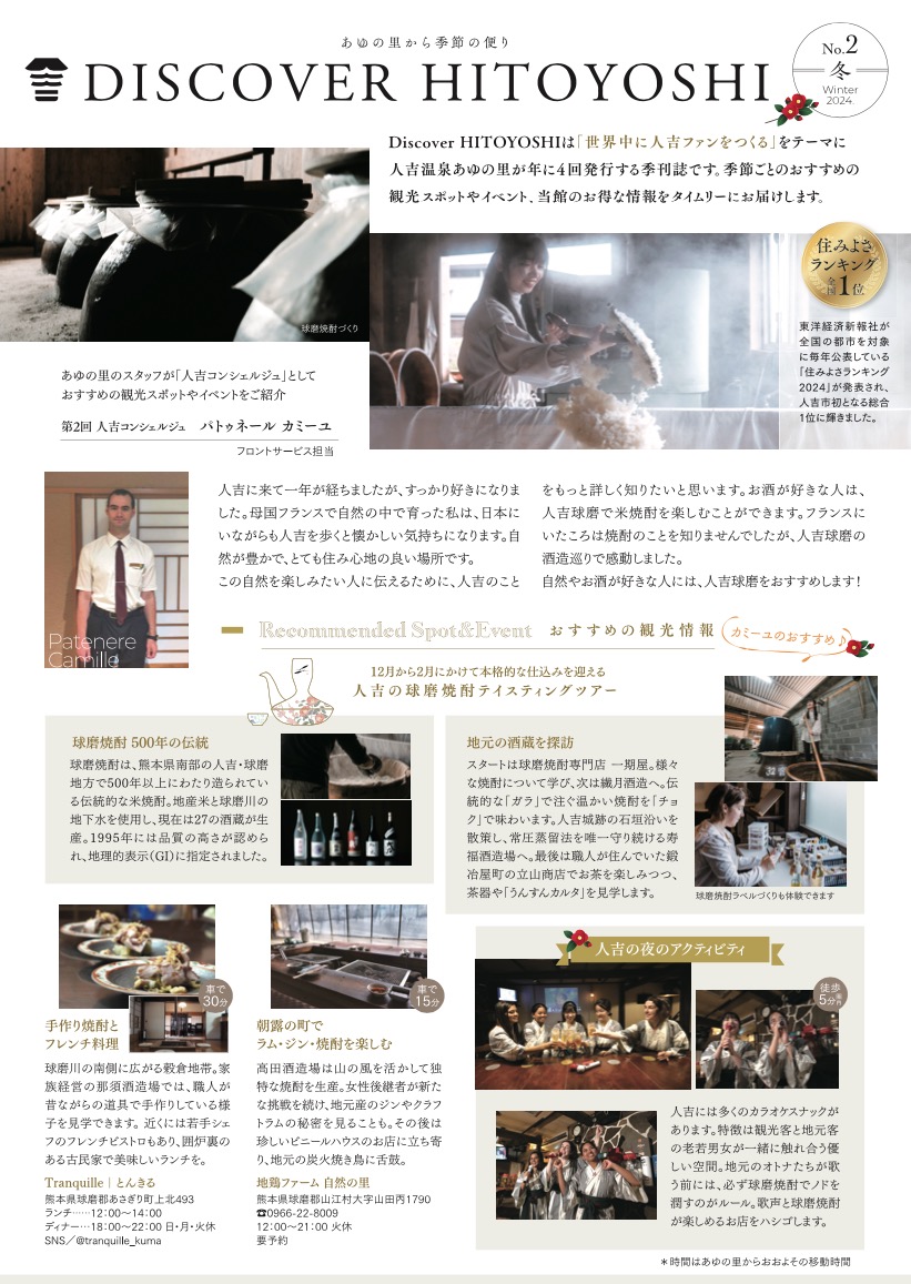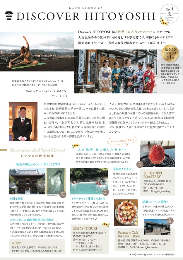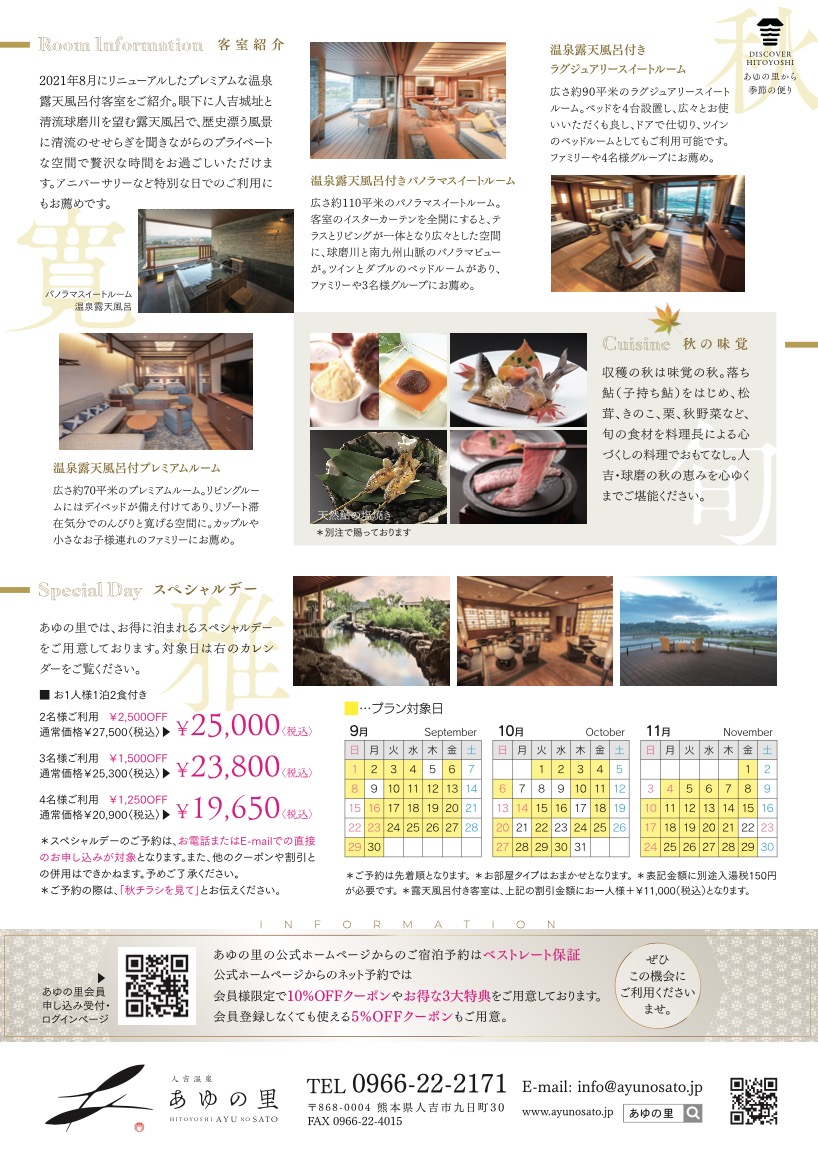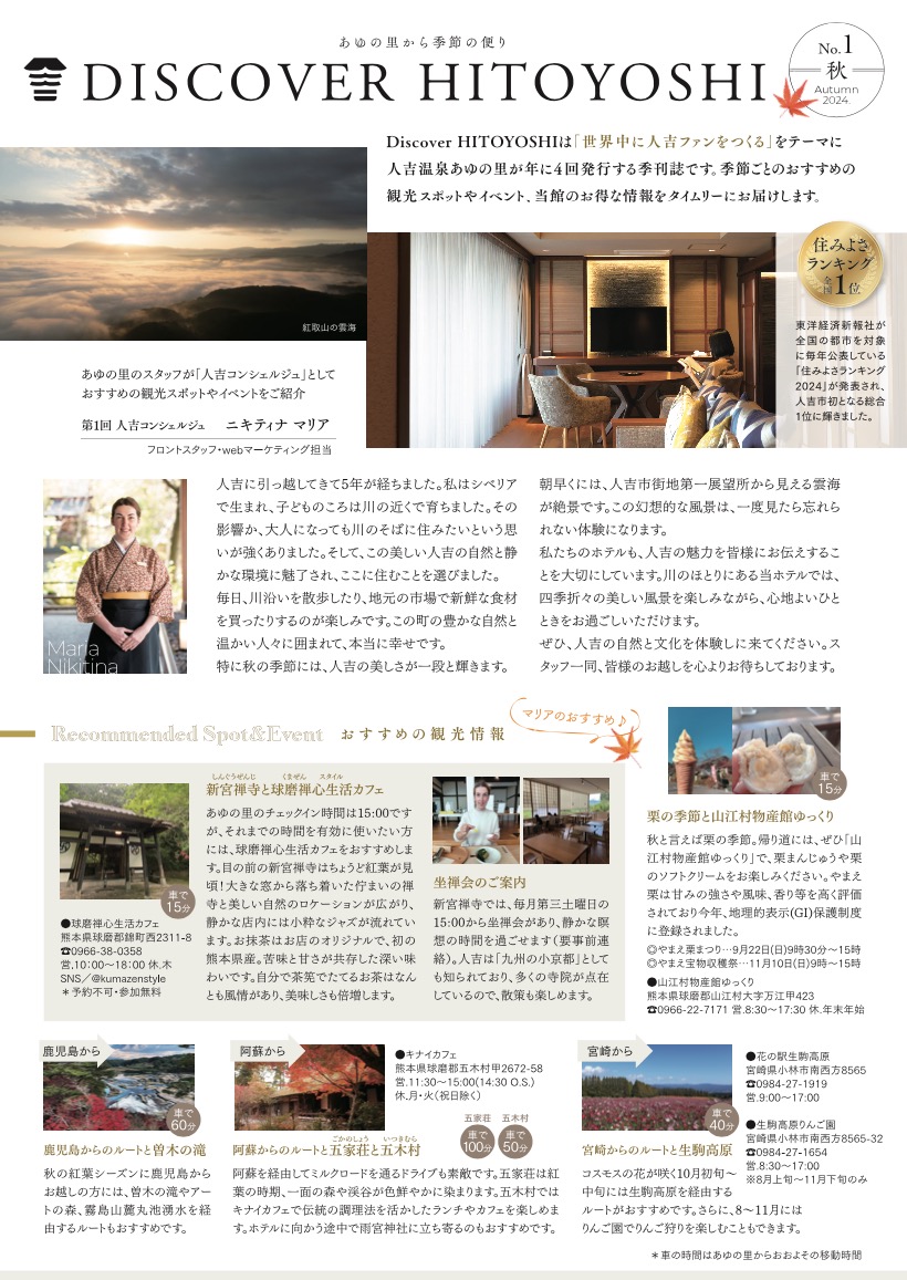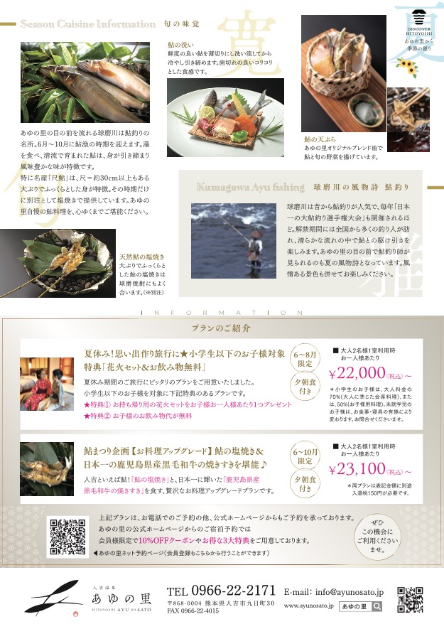 清流山水花 あゆの里様 熊本県の人吉で「人吉づくし」のおもてなしを提供している旅館、清流山水花 あゆの里様のブランドブック、動画、ECサイト、リクルートサイト、パンフレットを制作させていただきました。 パンフレット春 表 パンフレット春 裏 パンフレット夏 表 パンフレット夏 裏 パンフレット秋 表 パンフレット秋 裏 パンフレット冬 表 パンフレット冬 裏
