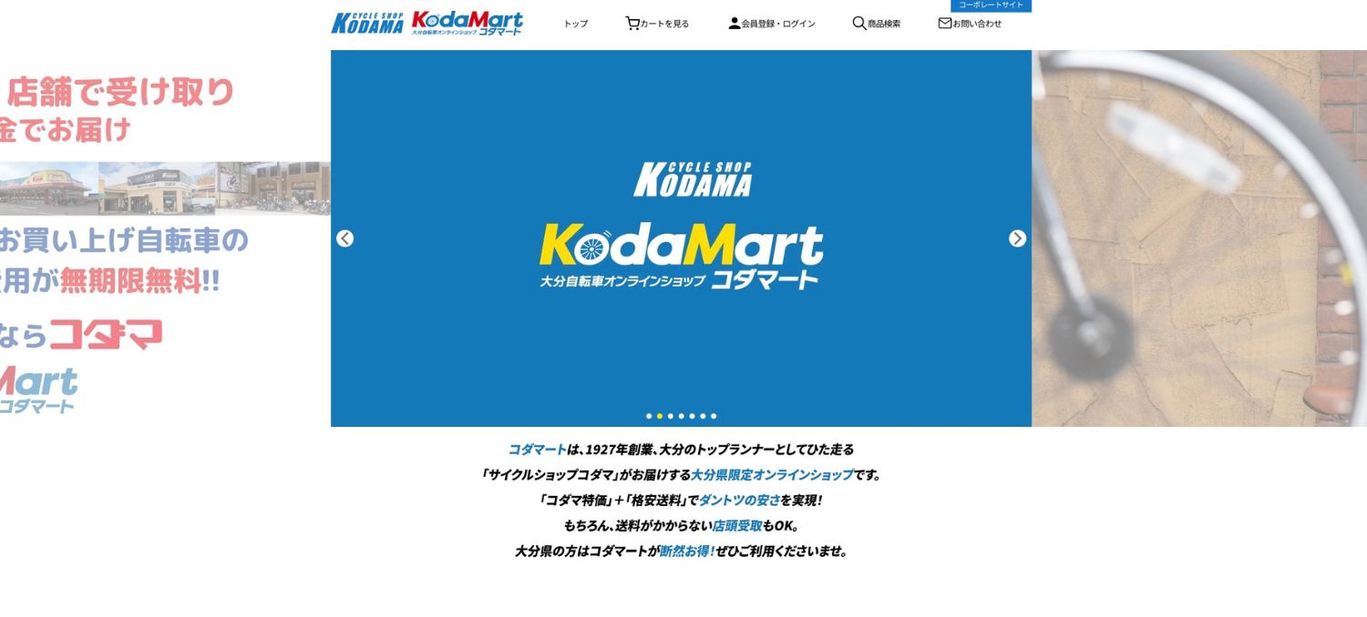 (有)コダマ様 1927年創業の老舗、大分県を中心に自転車販売業を営む、サイクルショップコダマ様の大分限定ショッピングサイト「コダマート」の作成をさせていただきました。 サイクルショップコダマ様ショッピングサイト:https://kodamart.shop-pro.jp/