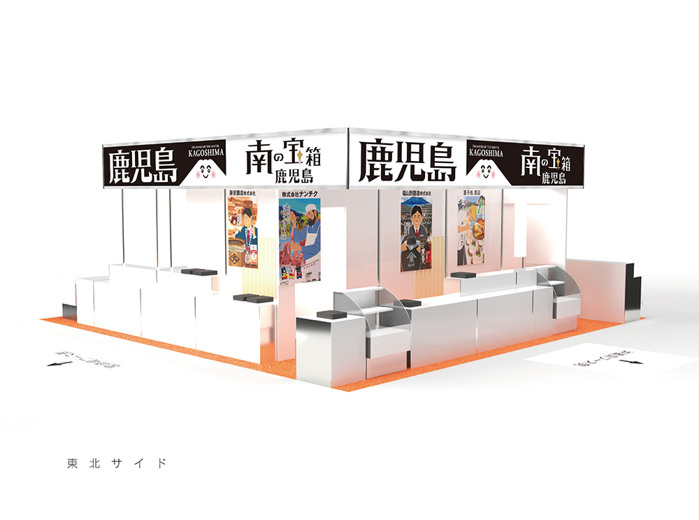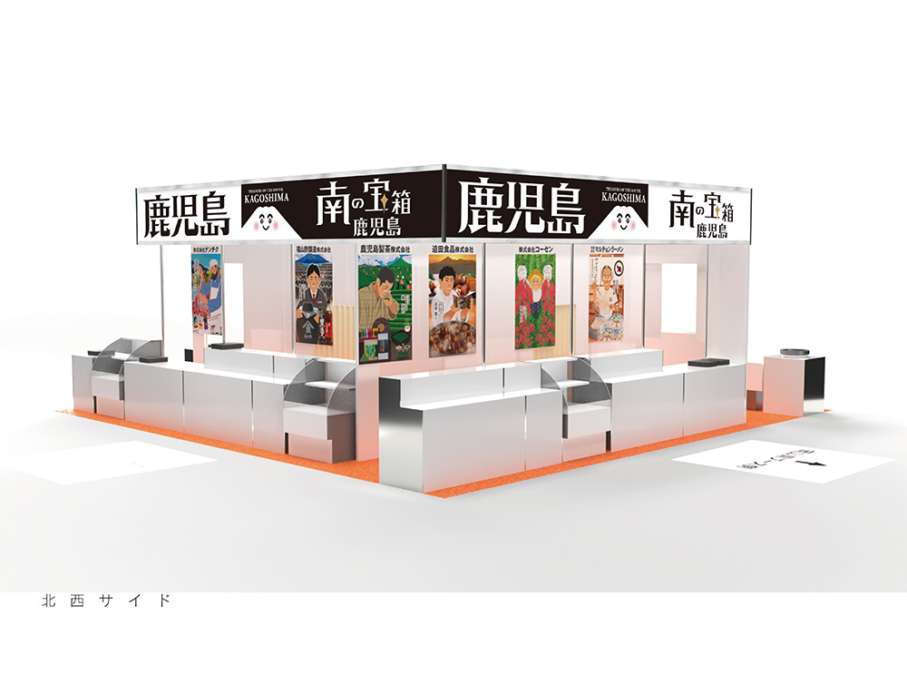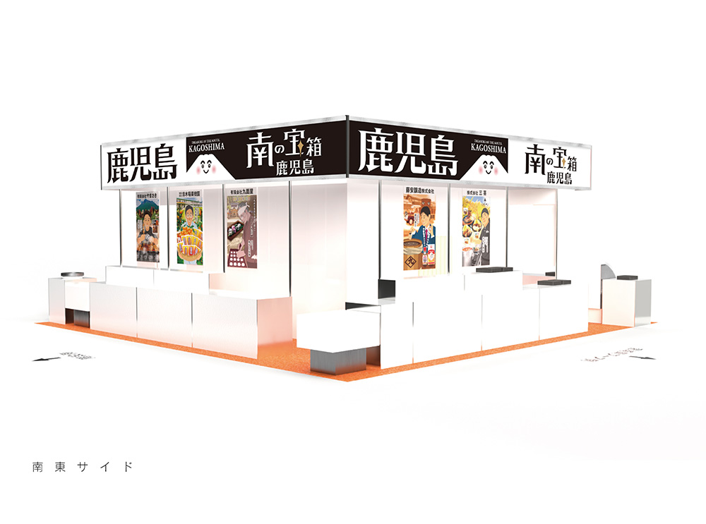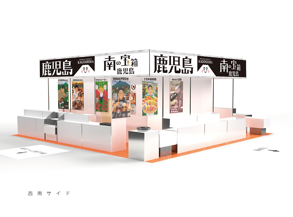 今年は「南の宝箱鹿児島」をキャッチフレーズに掲げ、バイヤーが来場しやすい・したくなる、開放的なブースデザインをコンセプトに、鹿児島ブース全体の集客力をアップするためのレイアウトを考案しました。