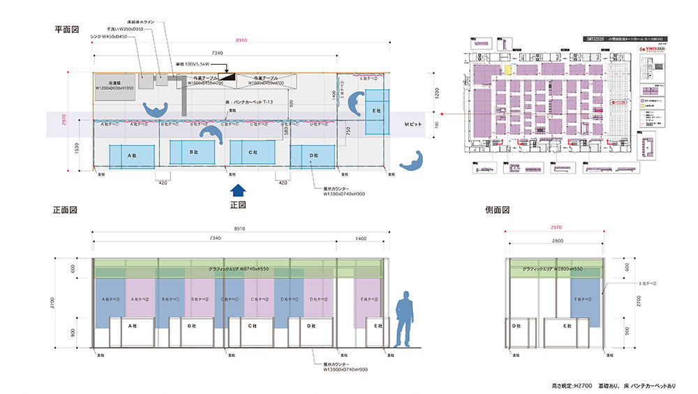 ブースイメージは出展社様の似顔絵・商品・特色のある地元風景等をイラストタペストリーで製作し、他県との差別化を図るとともに、話題性のある親しみやすい空間作りを心掛けました。