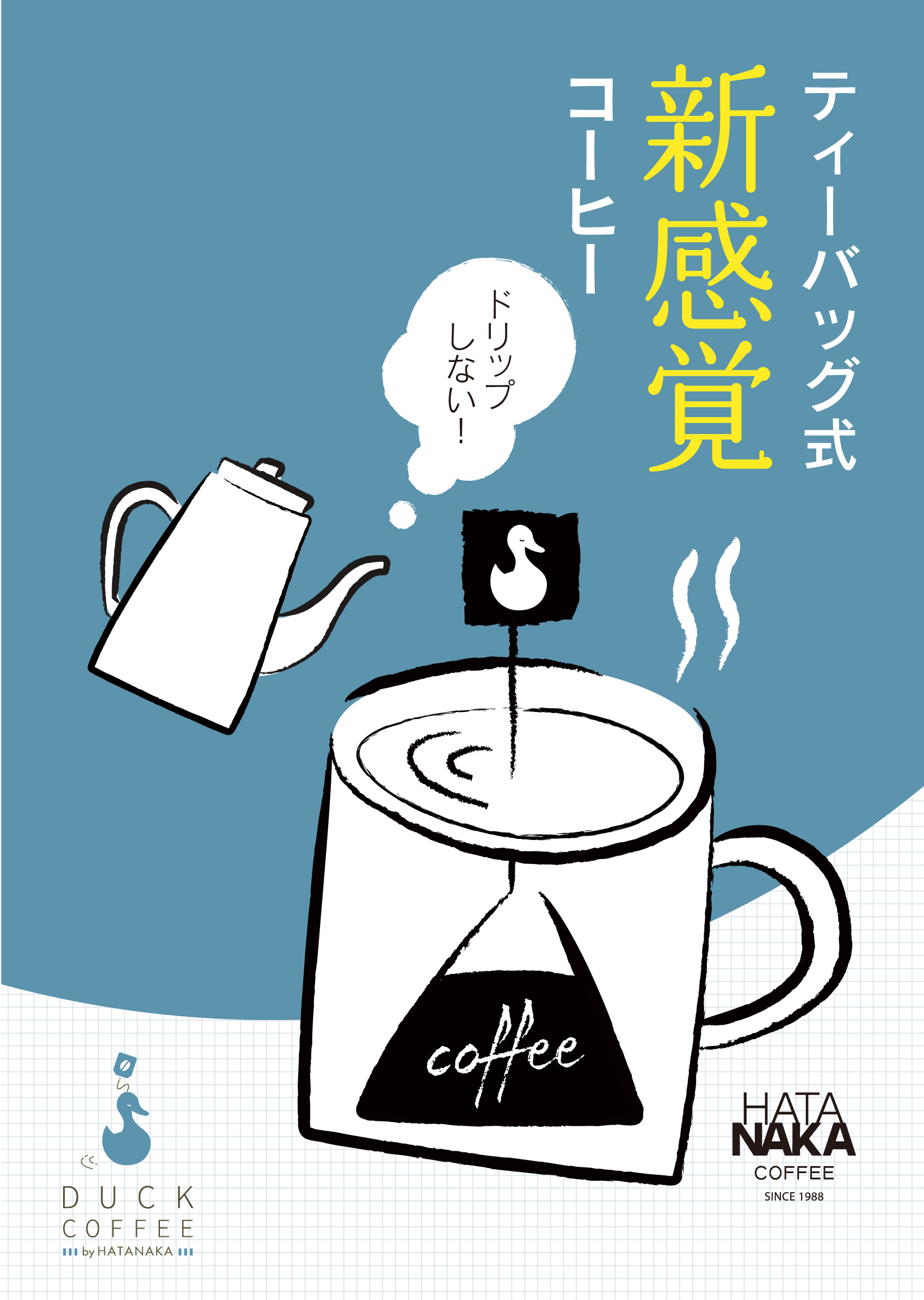 HATANAKA COFFEE様 鹿児島市内に3店舗お店を構える老舗コーヒー店、HATANAKA COFFEE様。新たに開発したティーバック型新感覚コーヒー「DUCK COFFEE」の現地撮影・取材、ロゴマーク、リーフレット2種、ミニリーフレット、名刺、Webサイト、展示会ブース、動画の制作をさせていただきました。 HATANAKA COFFEE様BRANDINGページ へ 展示会ブースイメージ タペストリA タペストリB